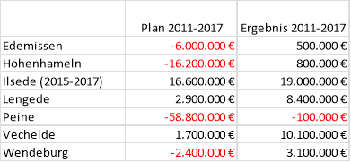 Ergebnisrechnungen der Stadt Peine und der Gemeinden liegen für die Zeit bis 2017 nur vereinzelt vor. Ein Vergleich der Jahresergebnisse mit denen des Landkreises Peine kann daher nicht erfolgen. Eine hohe Aussagekraft und Genauigkeit haben jedoch die vorläufigen Ergebnisse zum Saldo aus laufender Verwaltungstätigkeit. Die nachstehende Tabelle weist aus, dass hier gegenüber den Planungen der Jahre 2011 bis 2017 im Ergebnis deutliche Verbesserungen vorhanden waren. Statt überwiegend negativer Werte wurden im Ergebnis der Jahressummen fast ausnahmslos Überschüsse erzielt.