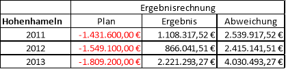 Unter Berücksichtigung der Planaufwendungen von jährlich rund 10,5 Mio. € (2011) bis 12,6 Mio. € (2013) ergibt sich eine Abweichung der Ergebnisse gegenüber den Planungen von über 20 %.