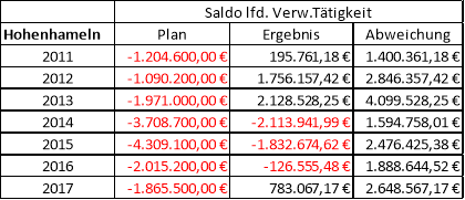 Eine ähnliche Entwicklung ist im Finanzhaushalt im Saldo aus laufender Verwaltungstätigkeit festzustellen. Da hier die Ein- und Auszahlungen eines jeden Jahresabgebildet werden, sind die Werte auch ohne endgültige Prüfung des Jahresabschlusses zuverlässiges Indiz zur finanziellen Lage. Für die Jahre 2011 bis 2017 ergibt sich folgende Gegenüberstellung:
