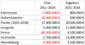 Demzufolge ist festzustellen, dass seitens Stadt und Gemeinden, wie auch beim Landkreis Peine, deutliche Verbesserungen gegenüber der Planung eingetreten sind. In den Jahren bis 2018 haben Stadt und Gemeinden in Summe keinen negativen Wert bei den Salden aus laufender Verwaltungstätigkeit ausgewiesen.