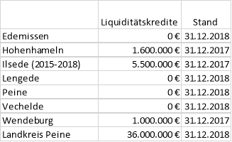 Die Gemeinde Ilsede ist aufgrund des Zukunftsvertrages verpflichtet, die Kassenkredite zurückzuführen. Dieses scheint nach dem Berichtswesen gegenüber dem Land Niedersachsen auch zu gelingen. Wendeburg weist am Jahresende Liquiditätskredite aus, da erst im Januar die Aufnahme von Krediten für Investitionstätigkeit erfolgt. Hohenhameln verfügte am Jahresende 2017 über Liquiditätskredite in Höhe von rund 1,6 Mio. € und verzeichnete im vorläufigen Ergebnis der laufenden Verwaltungstätigkeit 2018 ein Defizit von rund 224.000 €, so dass Ende 2018 ein Kassenkreditbestand von etwa 1,8 Mio. € vorhanden gewesen sein dürfte. Der Landkreis Peine weist demgegenüber deutlich höhere Kassenkredite aus.