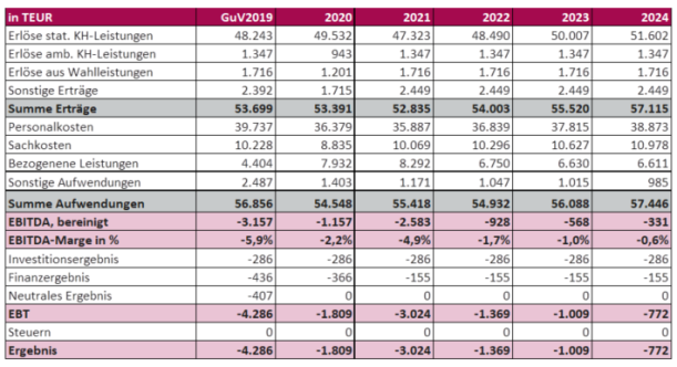 Sollten die Verhandlungen mit dem Elisabeth Vinzenz Verbund nicht zu einem tragfähigen Ergebnis führen, ist hinsichtlich der benötigten Finanzausstattung zu berücksichtigen, dass für 2020 ein maximaler Finanzbedarf von 7 Mio. € gesehen wird. Hinzu kommen mögliche Abgeltungen für den grundbuchlich gesicherten Kredit in Höhe von 8 Mio. €. Liquide Mittel werden generell für die Zahlung von Personalaufwendungen von 2 Monaten erwartet, so dass ein Sockelbetrag von etwa 7 Mio. € benötigt wird. Hinzu kommen die nach dem aufgeführten Real Case erwarteten Verluste von 8 Mio. € der Jahre 2021 bis 2024, so dass insgesamt ein Finanzbedarf von 30 Mio. € gesehen wird.