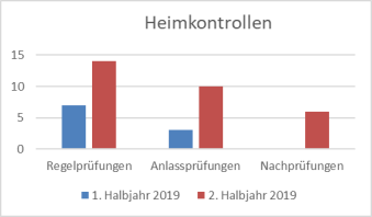 Seitens der Heimaufsicht wurden im ersten Halbjahr 2019 insgesamt 7 Heimkontrollen in Form von Regelprüfungen und weitere 3 Anlasskontrollen aufgrund von Beschwerden durchgeführt.