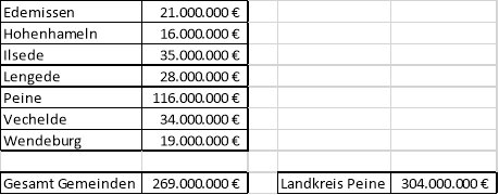 Der Landkreis Peine erhält danach voraussichtlich Schlüsselzuweisungen in Höhe von insgesamt 41.167.000 € und damit rund 3,1 Mio. € mehr, als bisher eingeplant.