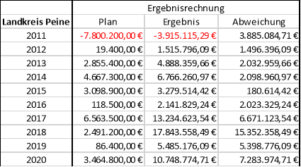 Für den Landkreis Peine liegen demgegenüber bereits geprüfte Jahresabschlüsse bis 2020 vor. Die Abschlüsse sind bereits vom Kreistag festgestellt. Auch hier haben sich gegenüber der Planung Verbesserungen ergeben, so dass sich folgende Übersicht ergibt: