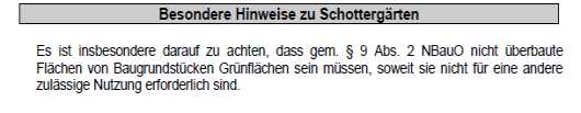 Dabei kann nur innerhalb von Baugebieten mit Bebauungsplan aufgrund bestehender Festsetzungen von festen Variablen ausgegangen werden. Eine weitere Möglichkeit wäre das Erlassen örtlicher Bauvorschriften durch die Gemeinden, die explizit das Verbot aller Arten von Schottergärten regeln.